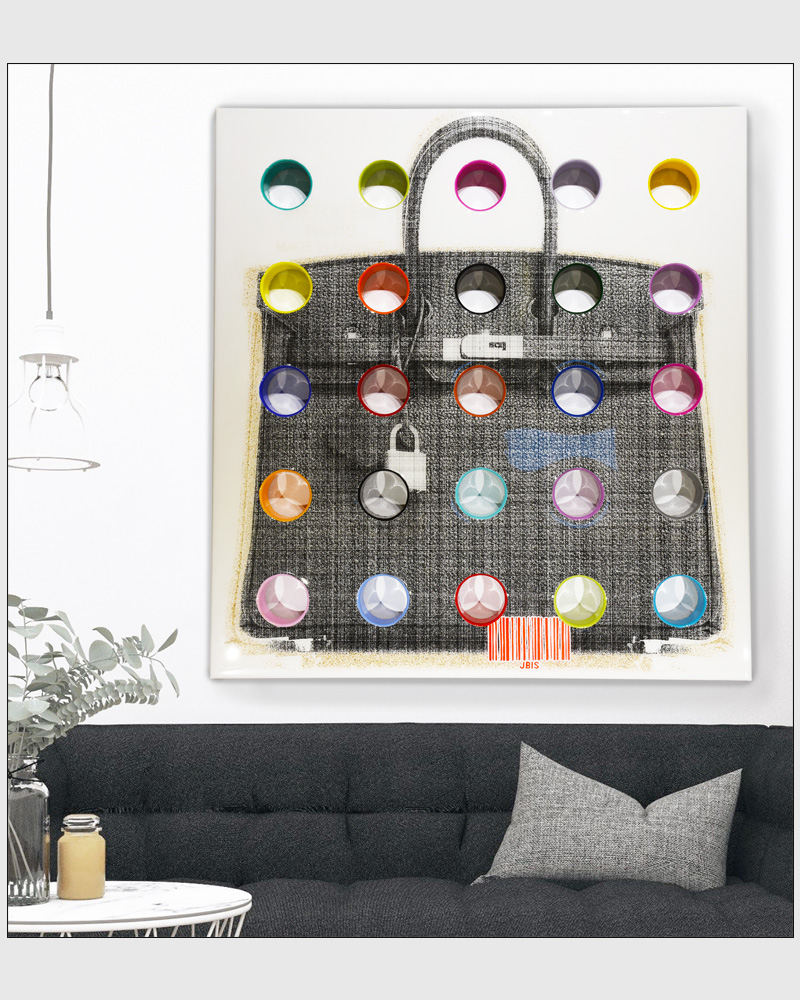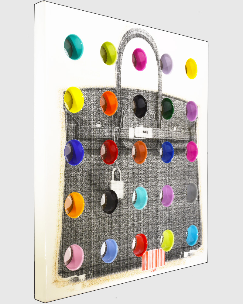 “BIRKIN” 45 by 48 inches, acrylic & mixed media on canvas mounted to 3D panel with 25 holes coated in resin (2020)