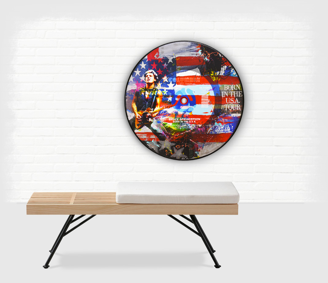 “BORN IN THE USA” 36 inches diameter, acrylic & mixed media on canvas mounted to 3D panel coated in resin (2020)