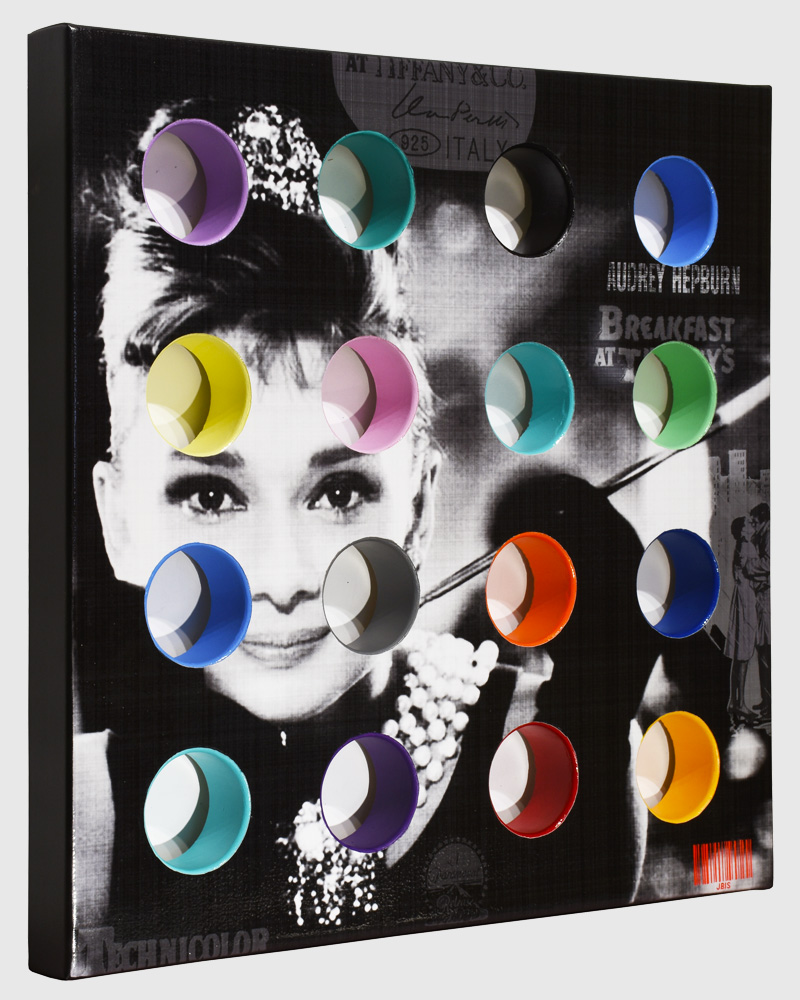 “TIFFANY&CO” 32 by 32 inches, acrylic & mixed media on 3D panel with 16 holes coated in resin (2020)